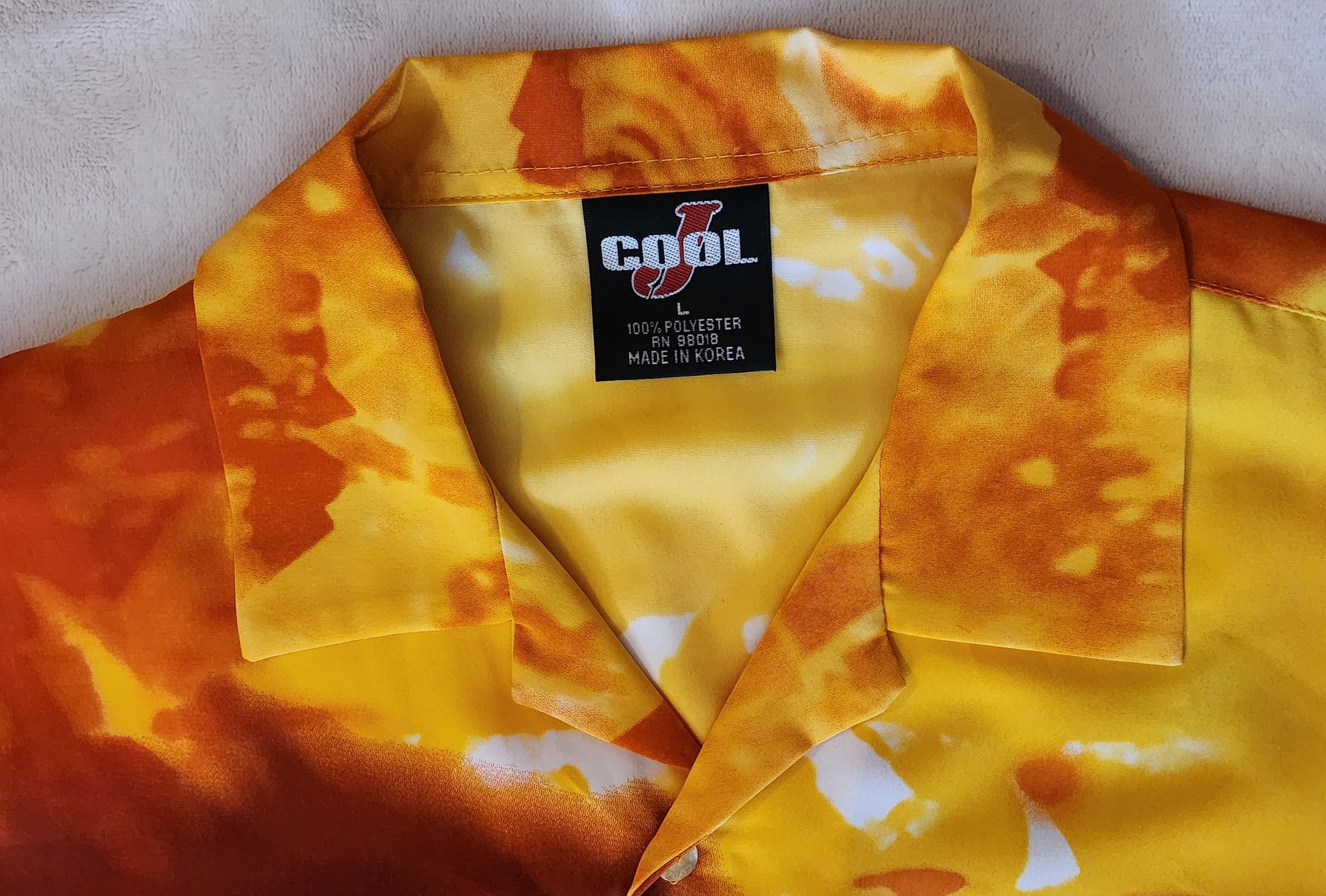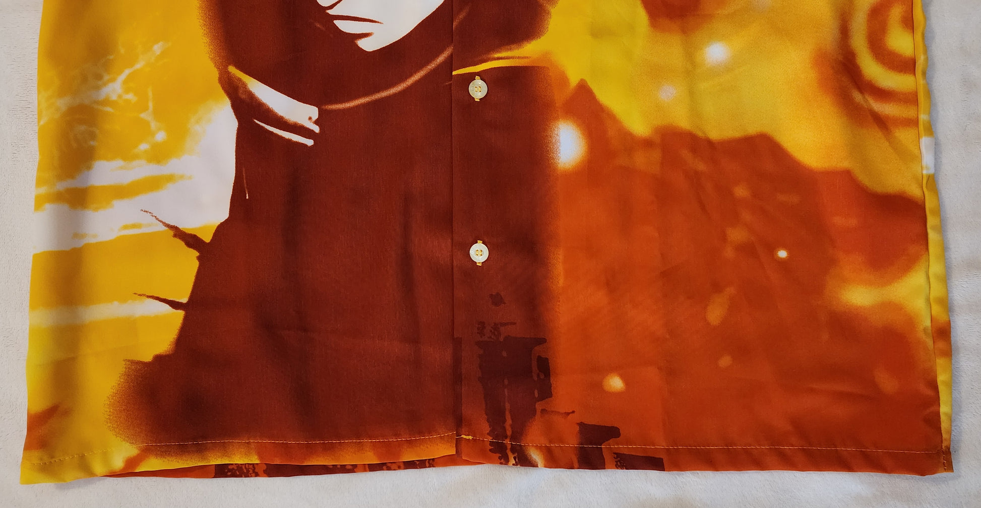 A "Large" adult size button down shirt featuring Samurai Shodown 64 / Samurai Spirits 64 artwork of Asura / Asra. The shirt has a gold, orange & red motif and pearl-colored buttons. Made in Korea.