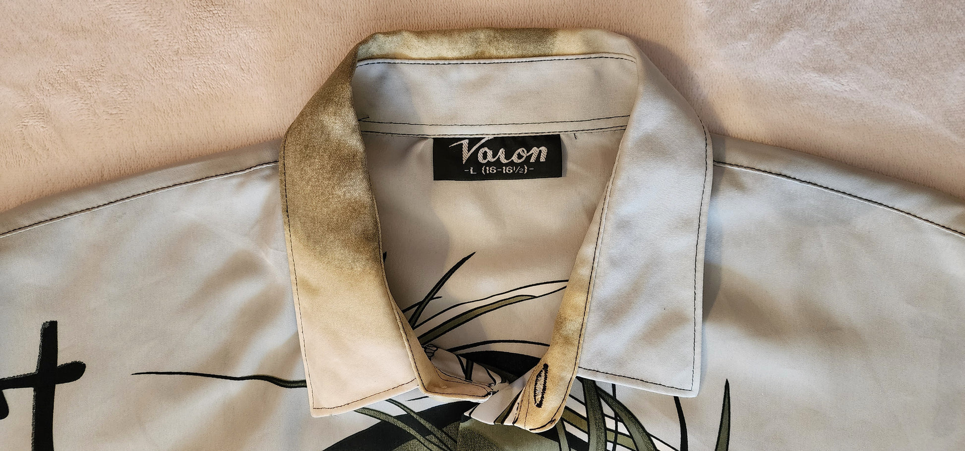 A "Large (16-16.5)" adult size button down shirt featuring Samurai Shodown 64 / Samurai Spirits 64 artwork of Haohmaru (Bust Version). The shirt has a light blue, green & white motif and clear buttons.