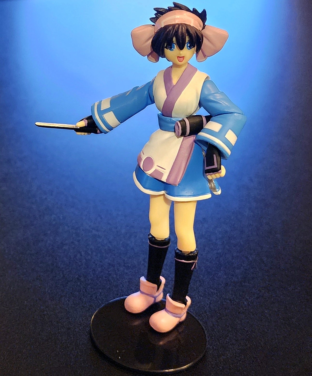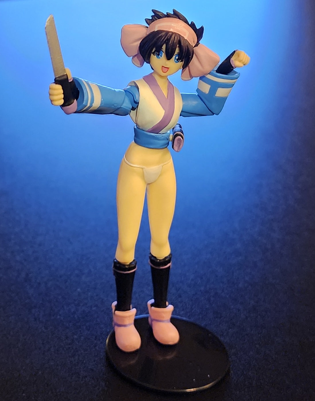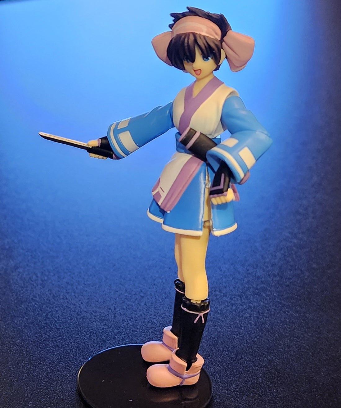A Japanese gashapon figure of Rimururu from SNK's Samurai Shodown / Samurai Spirits. In this version of the figure, she can hold her short sword / knife weapon! 🗡 The sword is a loose item and her sword sheath connects to her back.