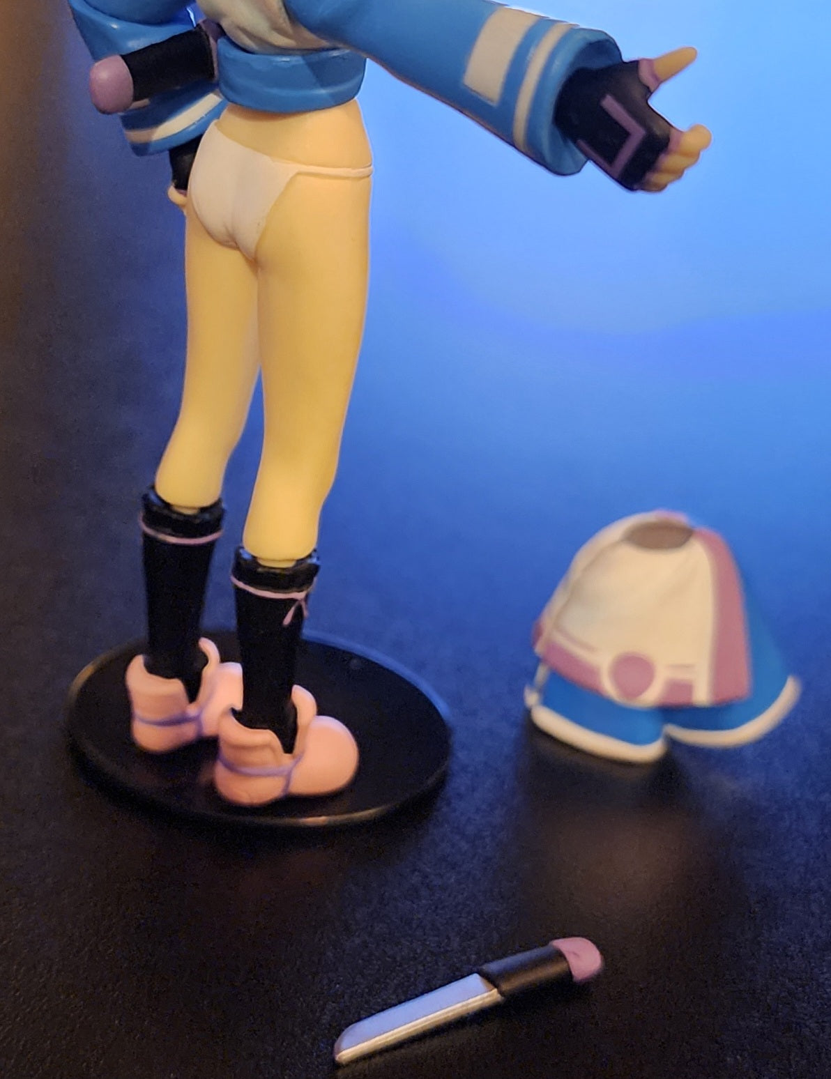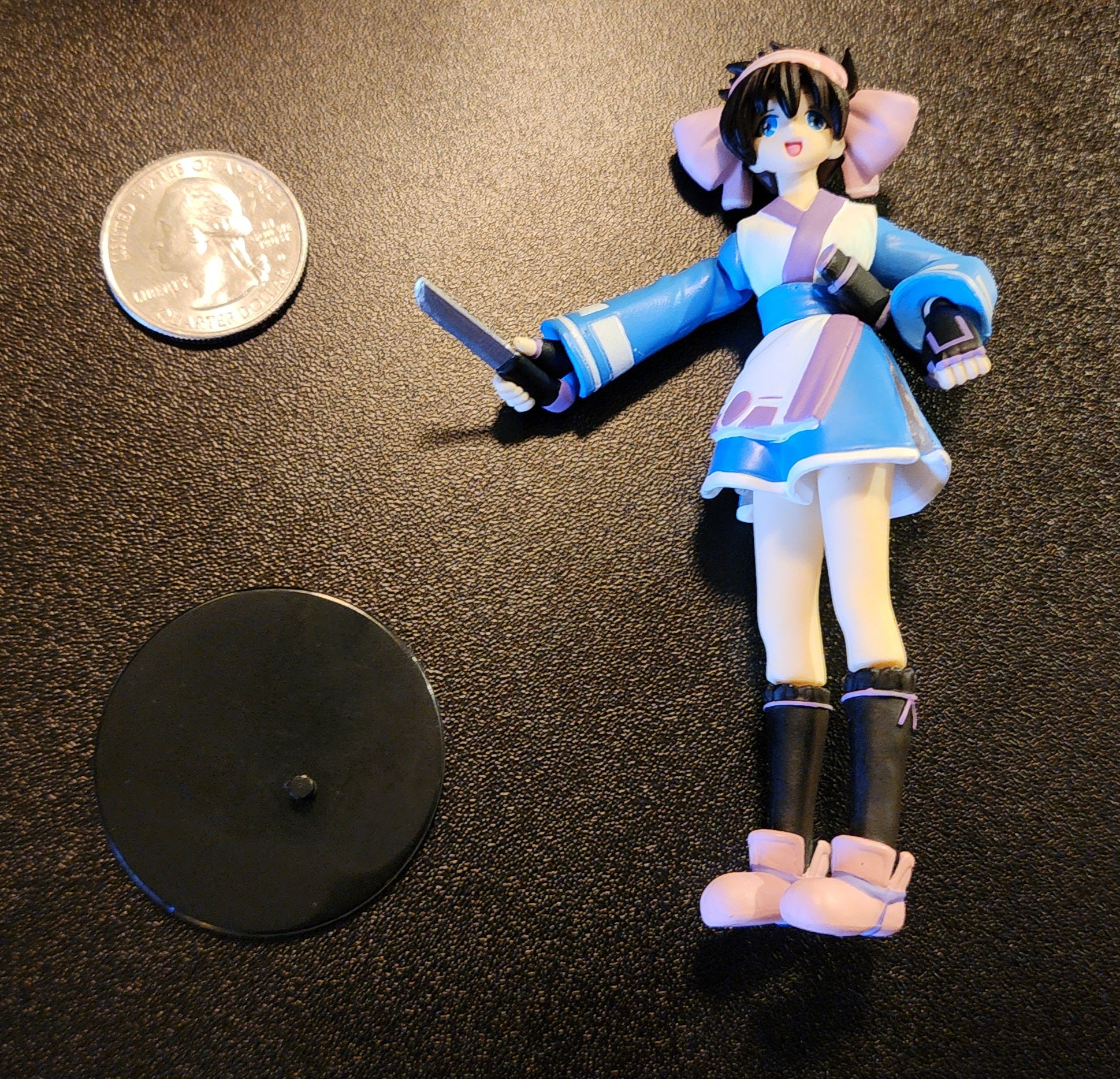 Her torso and wrists can articulate to change her posing capabilities and her sword-holding hand position enables her to give a thumbs up or thumbs down! 😎👍🏼 Her head can also articulate to change her pose slightly. The bottom half of Rimururu's clothing can be removed (2 parts). This 3.5" figure comes with a circular black base that she attaches to for easy displaying. The bottom of the base has "©SNK Playmore" inscribed.