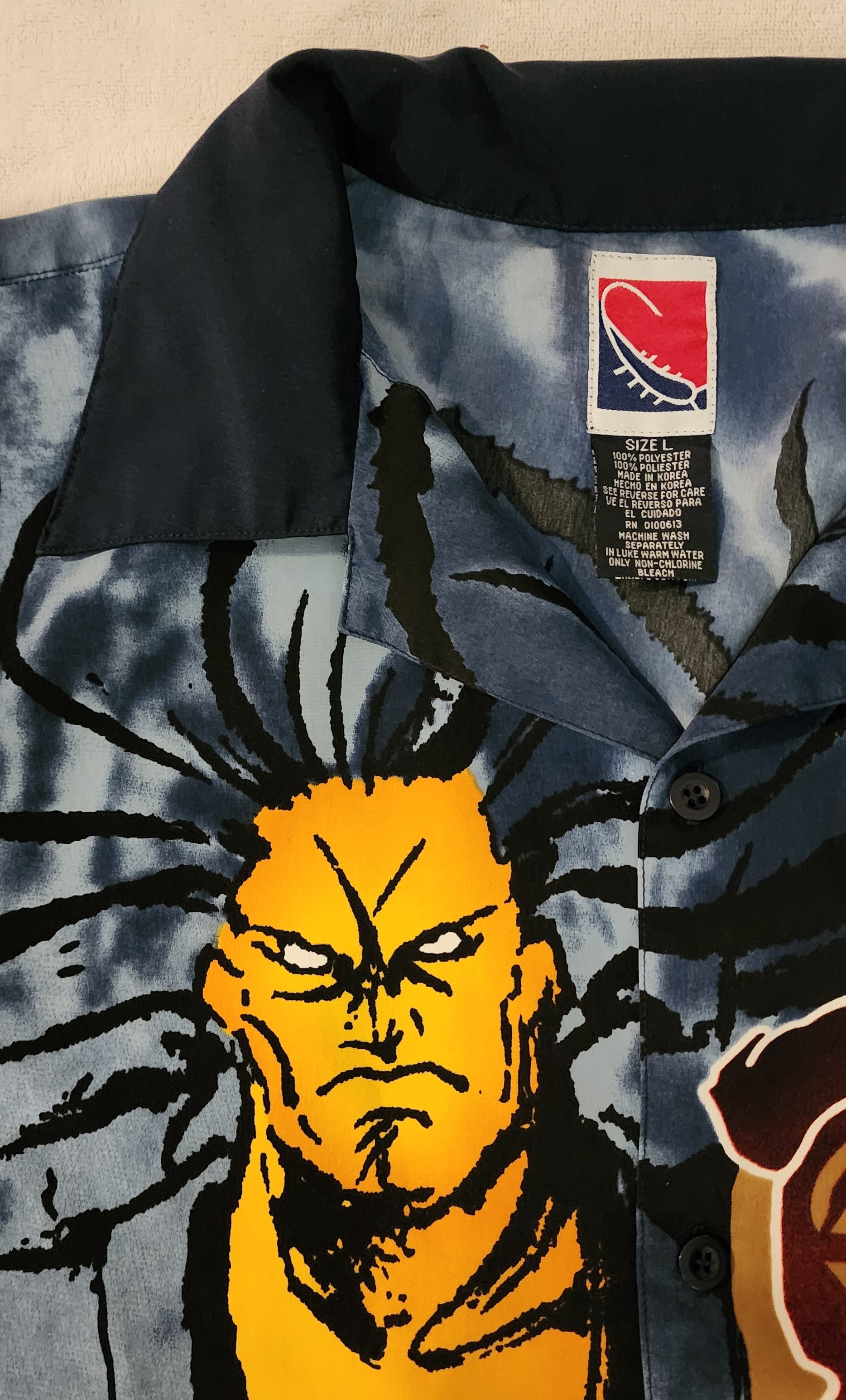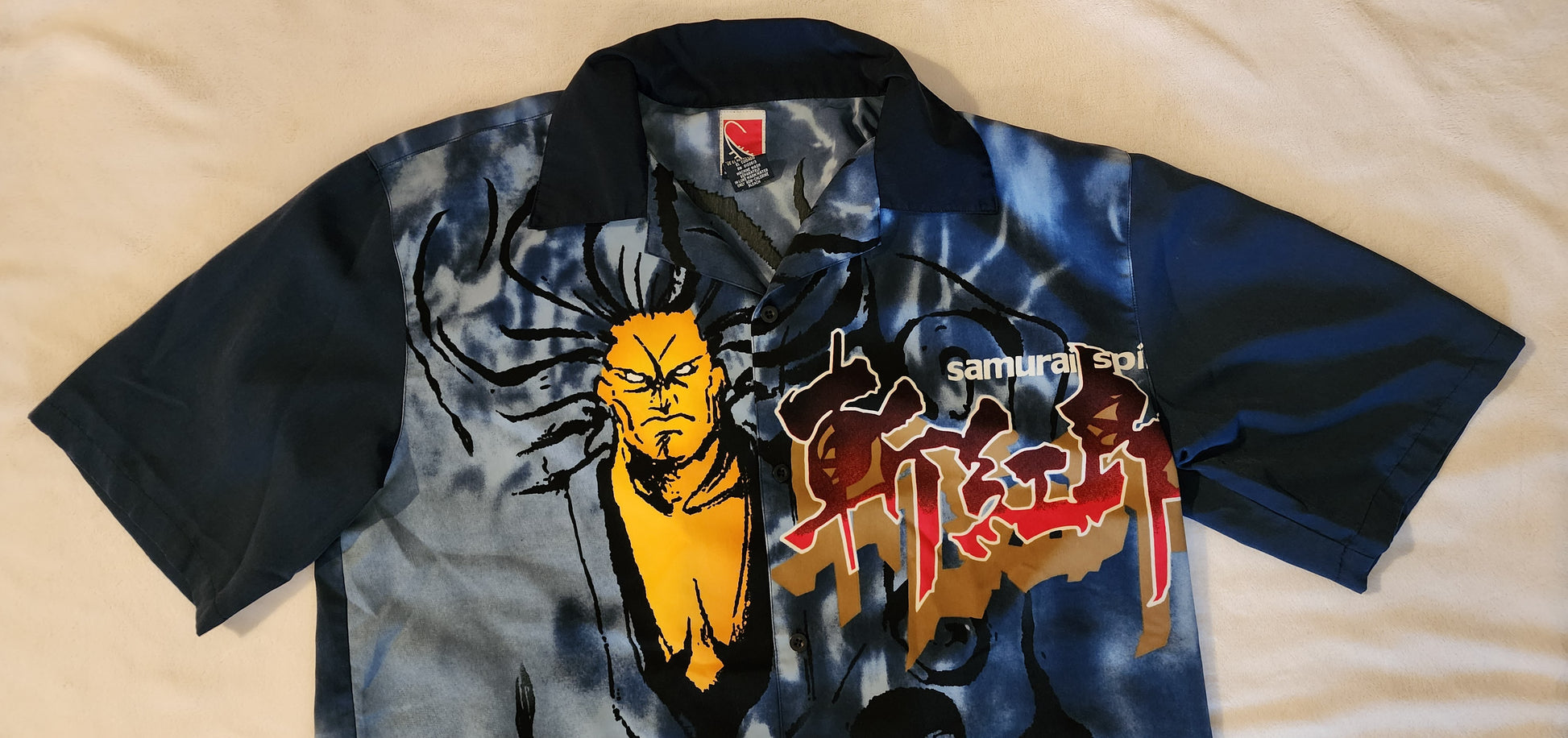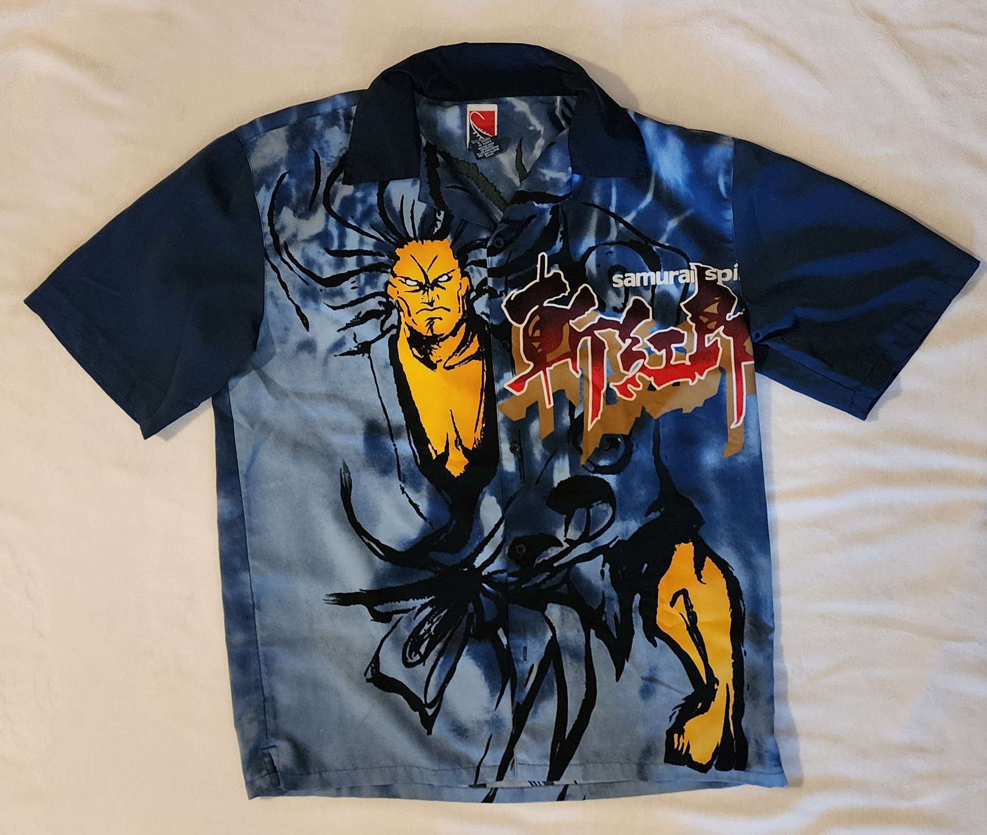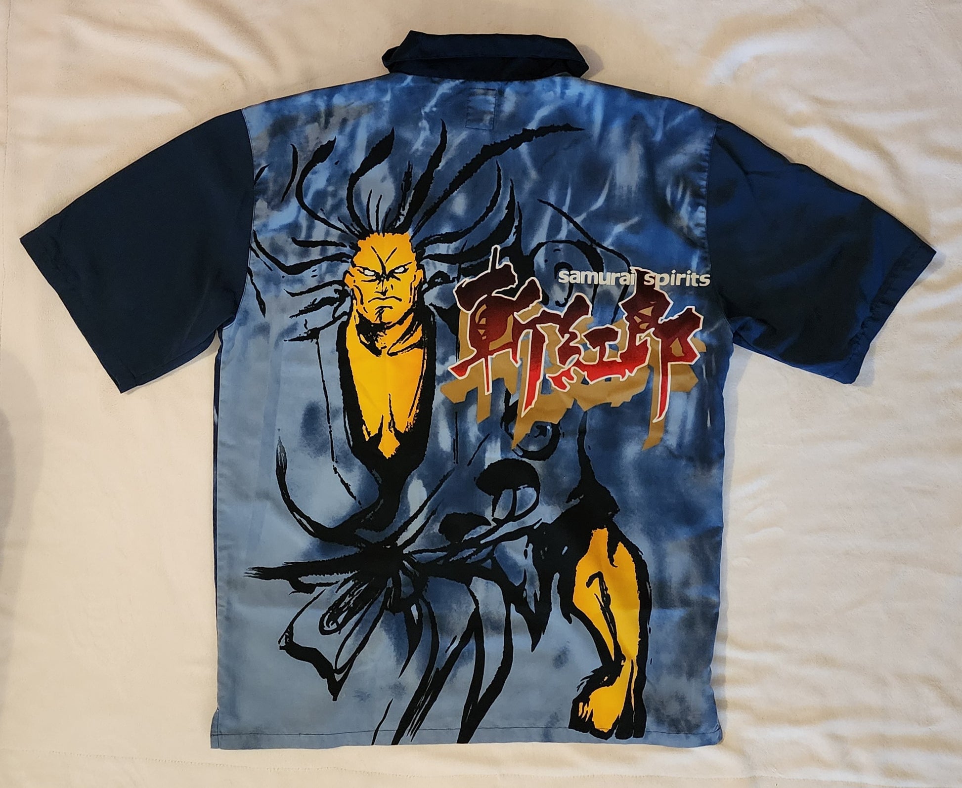 A Large Size button down shirt featuring Samurai Shodown III / Samurai Spirits 3 artwork of Zankuro and the words "Samurai Spirits" in white. The shirt has a light blue / navy blue theme and black buttons.