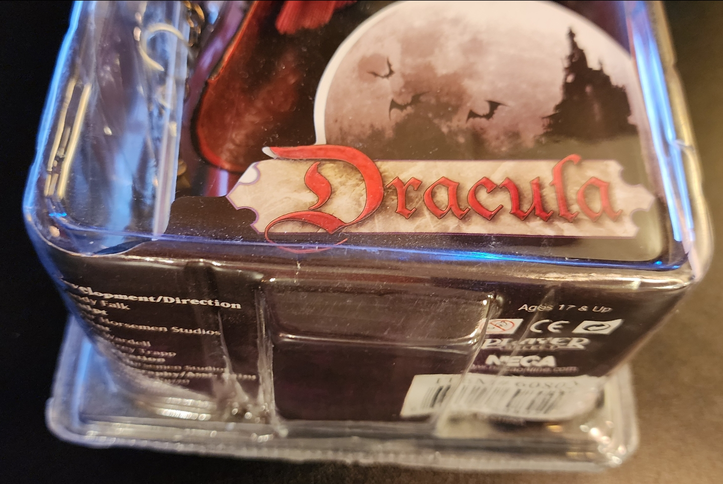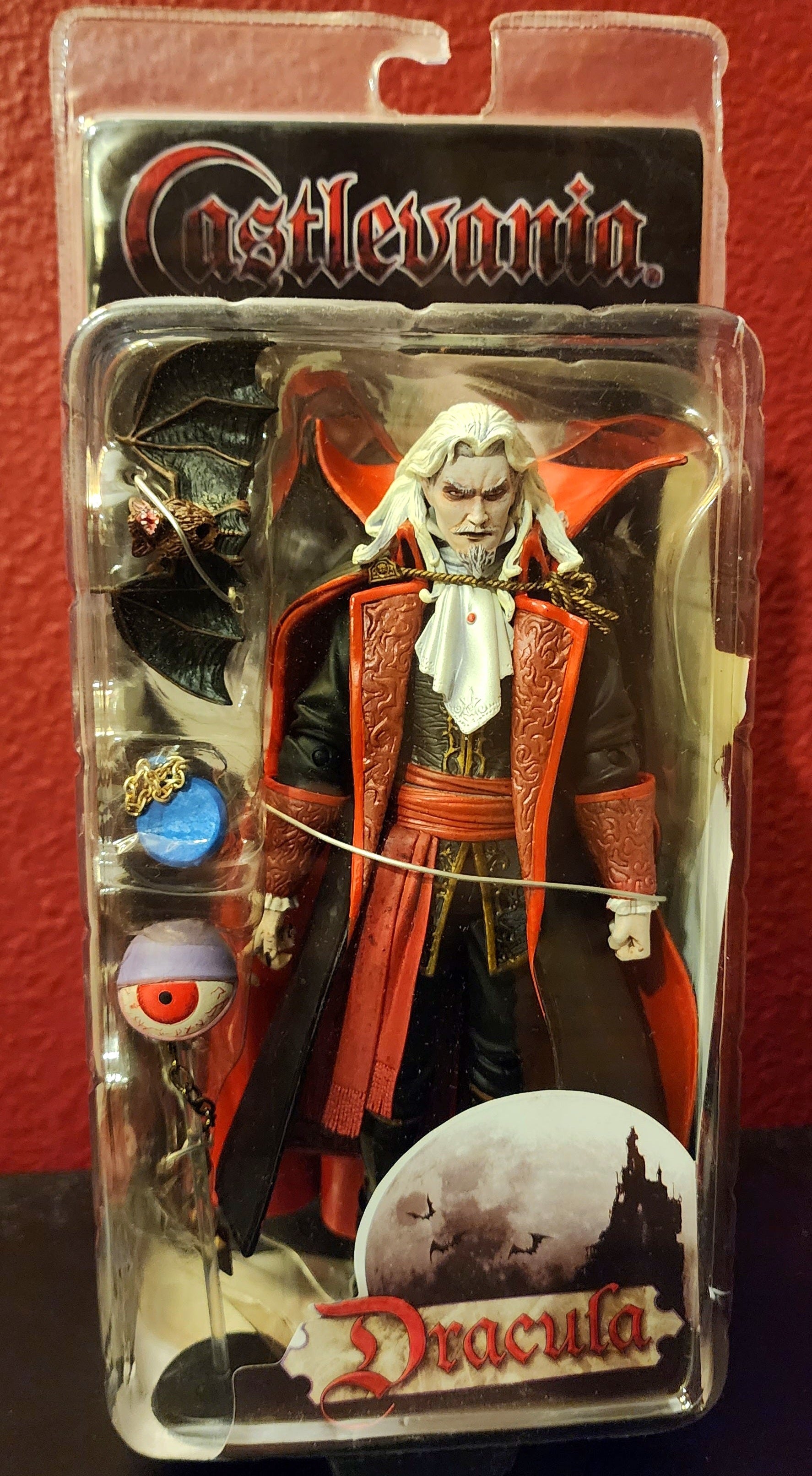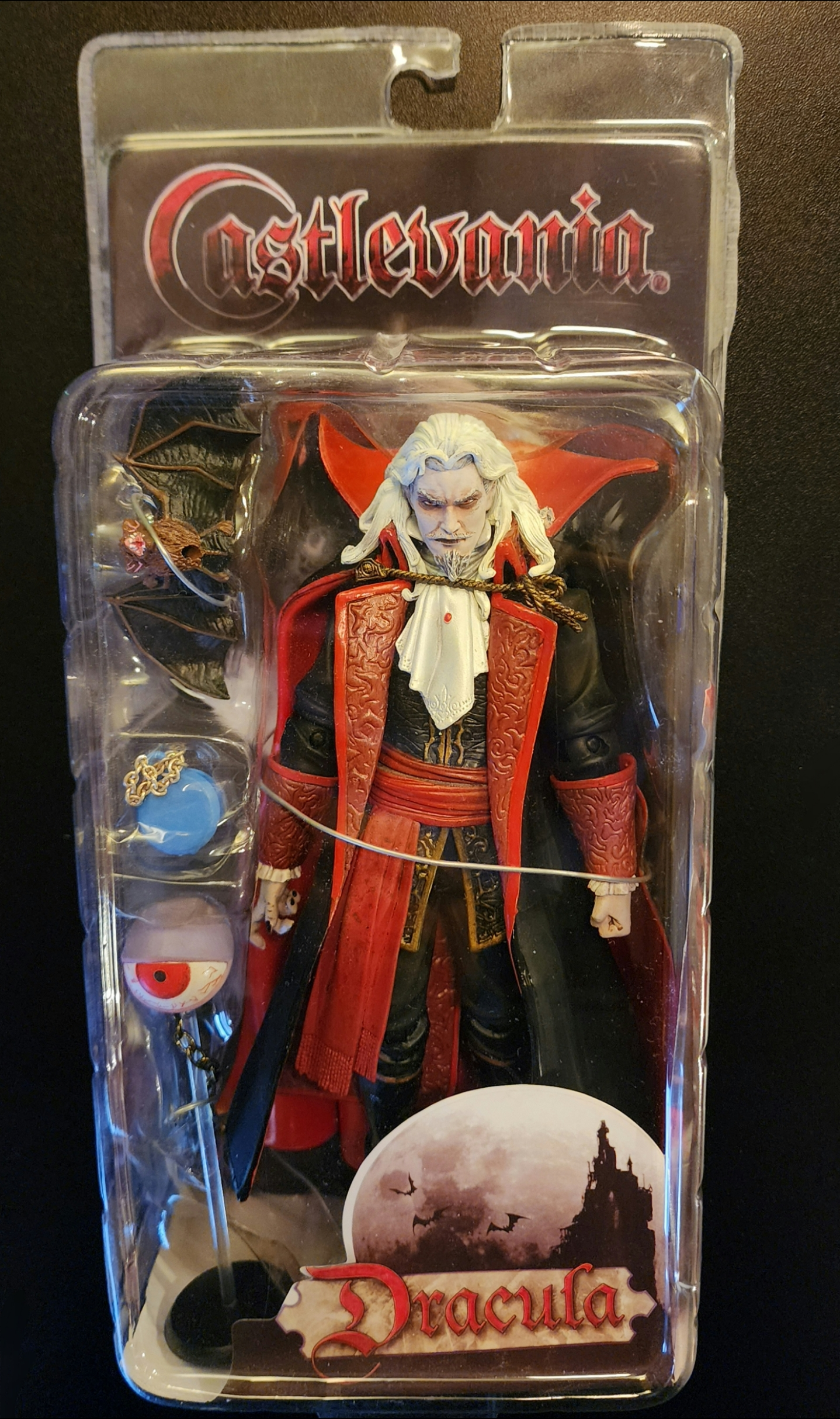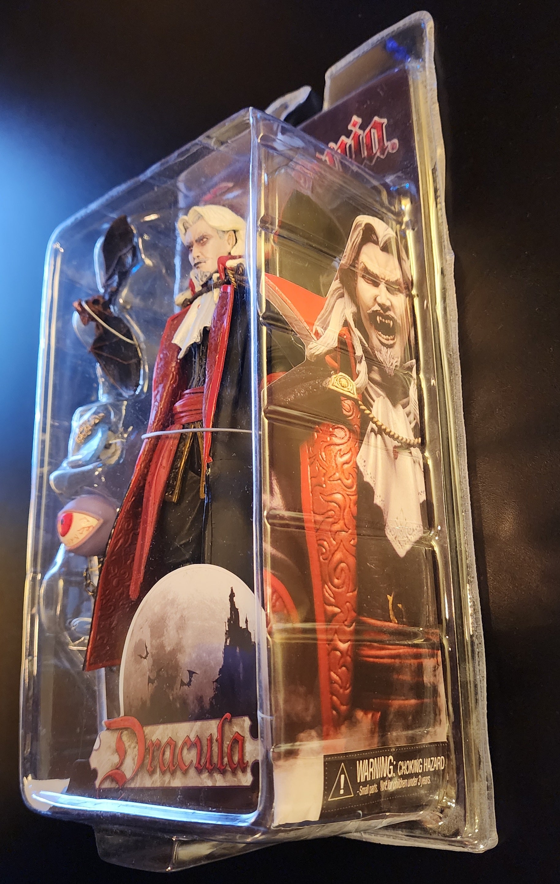 This is a sealed Dracula figure made by NECA in 2007. This impressive boxed figure comes packaged with several accessories inside including a vampire bat, eyeball monster with chain, and other item with chain.