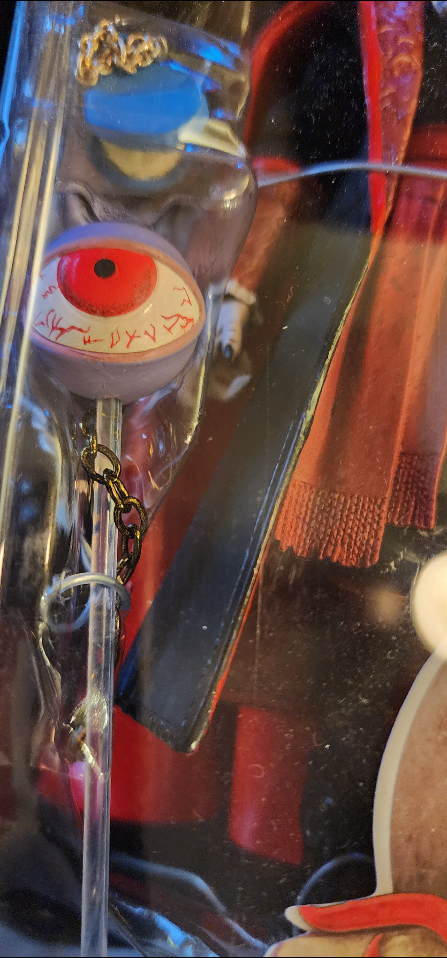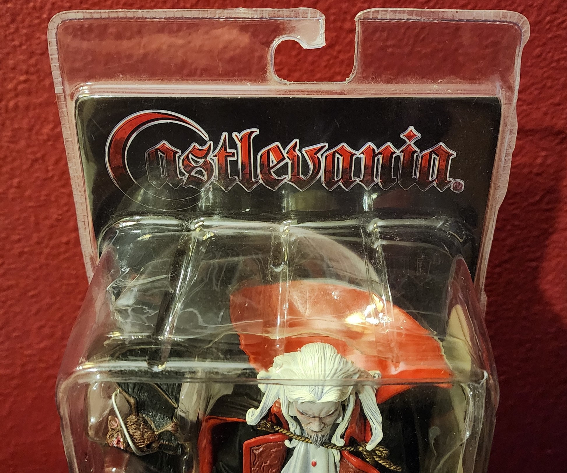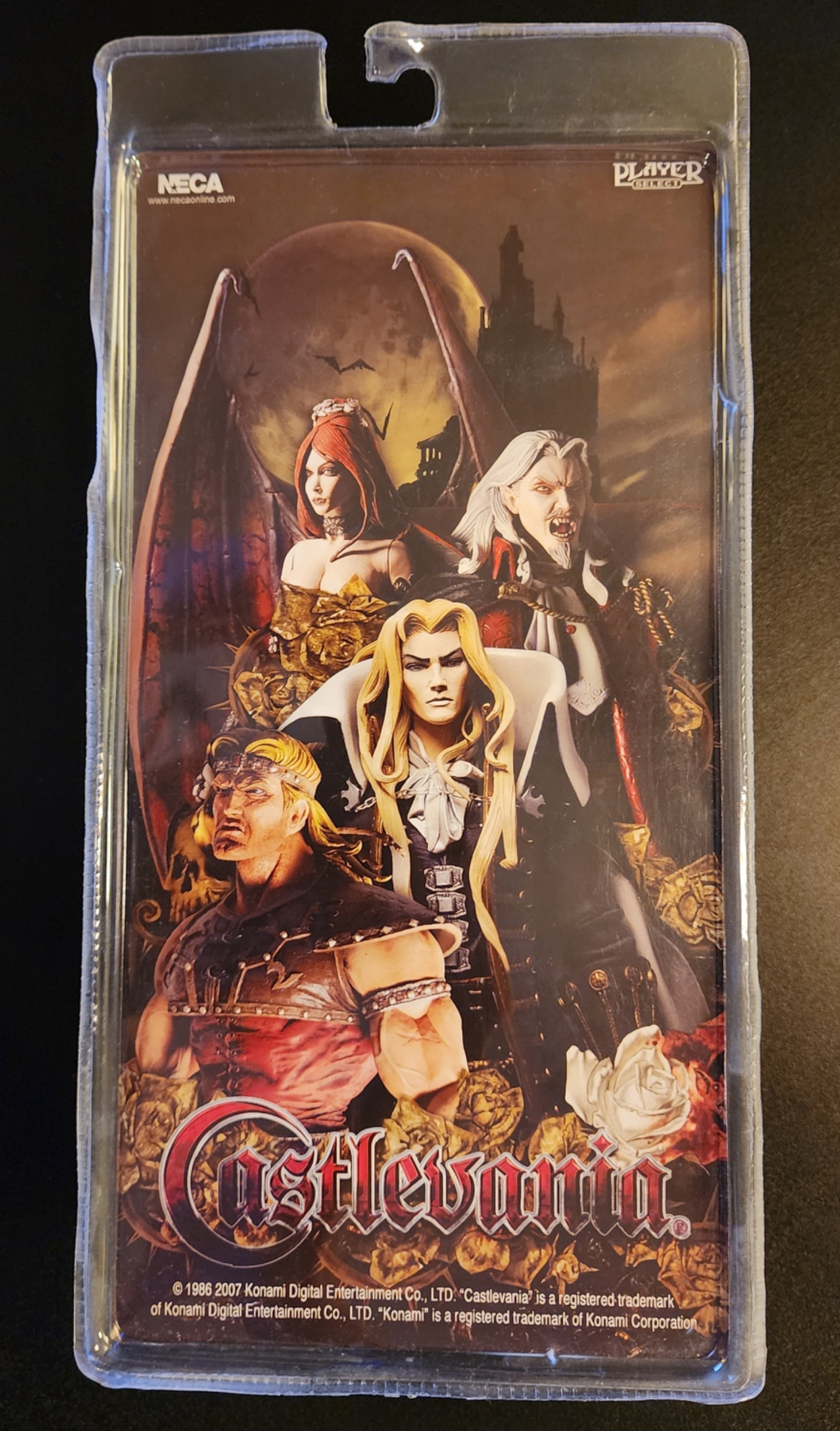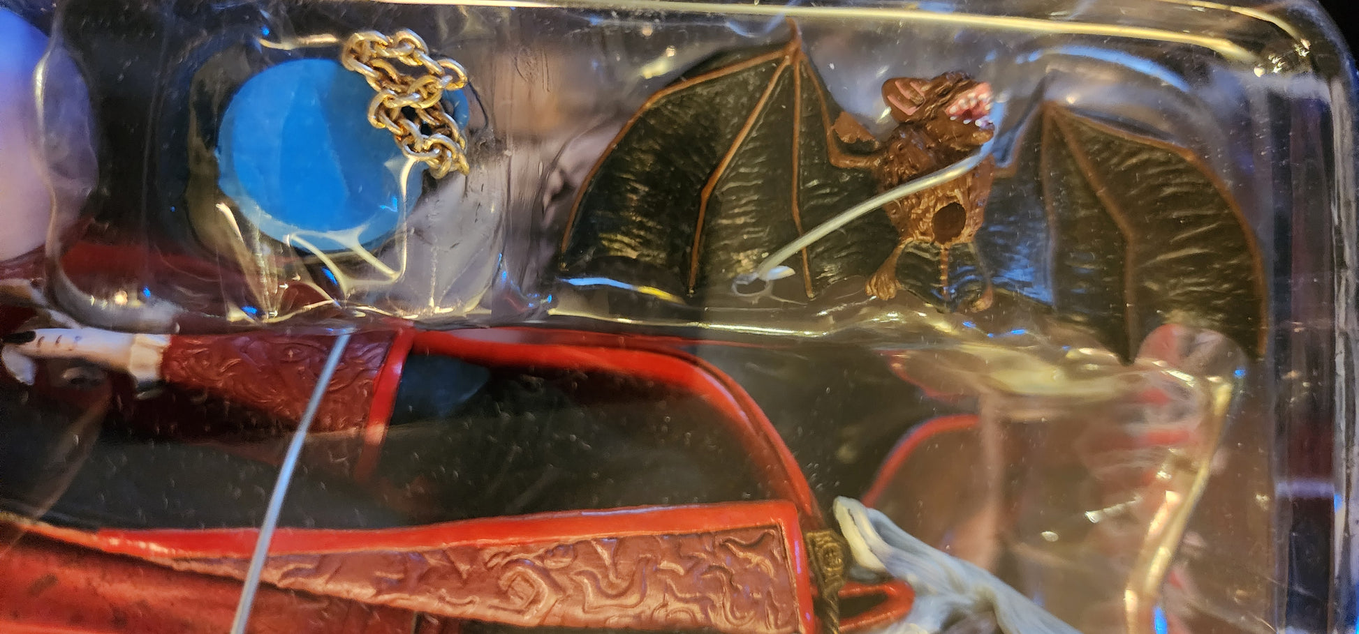This is a sealed Dracula figure made by NECA in 2007. This impressive boxed figure comes packaged with several accessories inside including a vampire bat, eyeball monster with chain, and other item with chain.