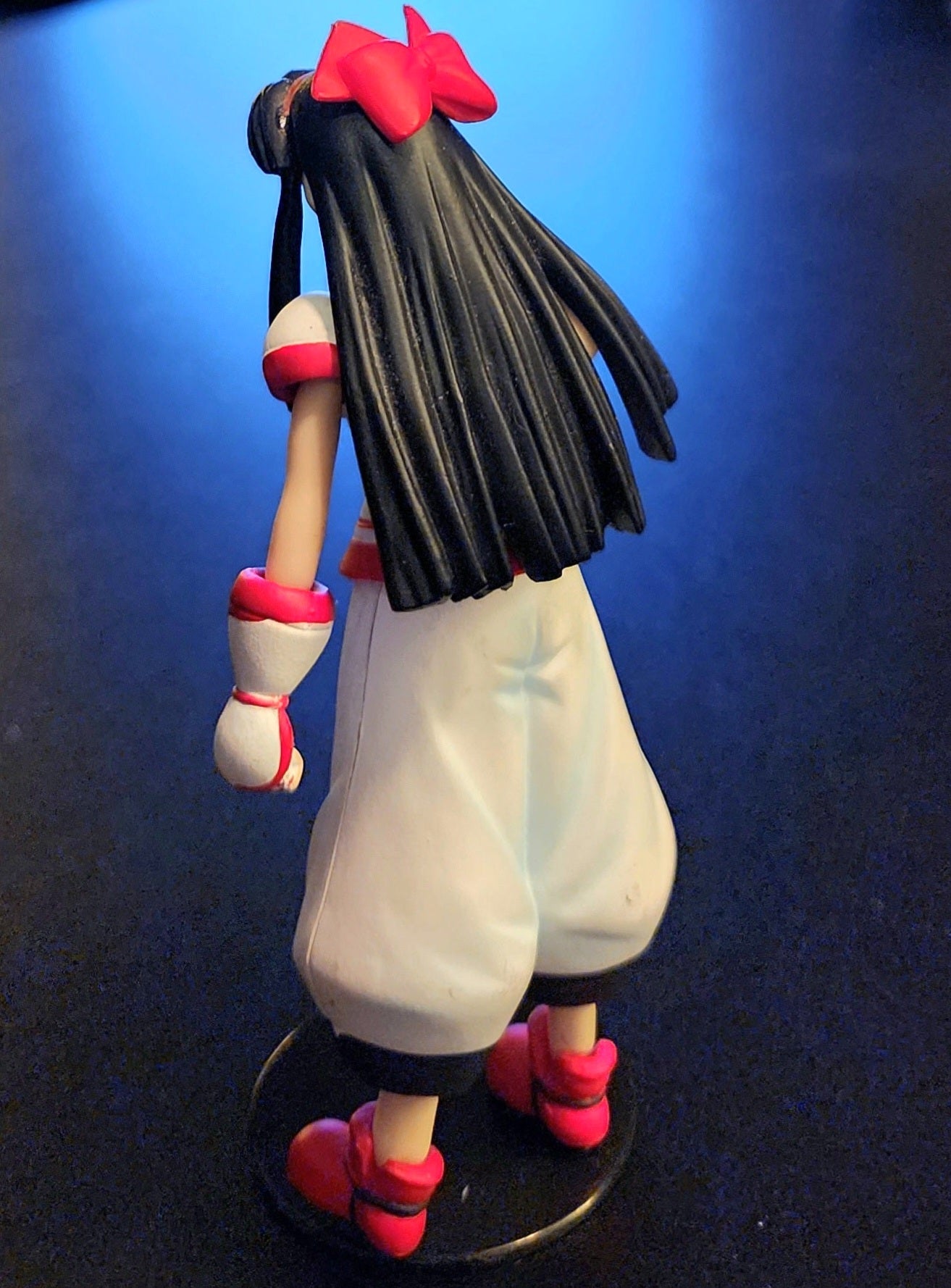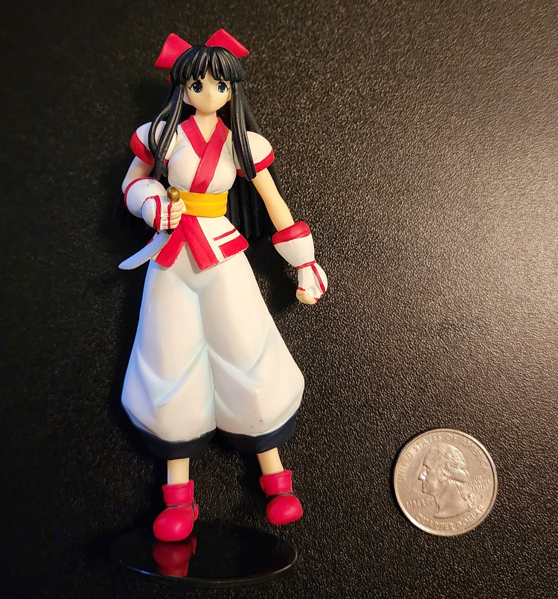 This Japanese gashapon figure of Nakoruru is made by Yujin. Nakoruru stands 4" tall and comes with circular black base that she stands on. Item comes with original paper advertisement from Yujin displaying other figures from this Samurai Shodown figure line.