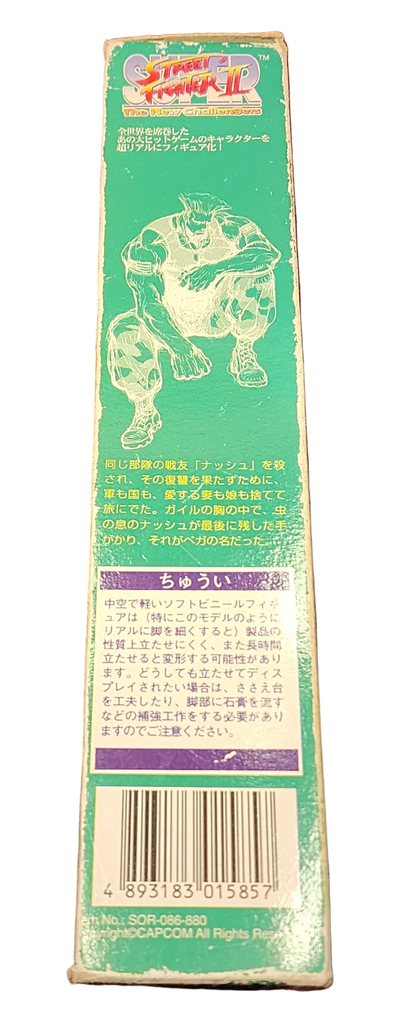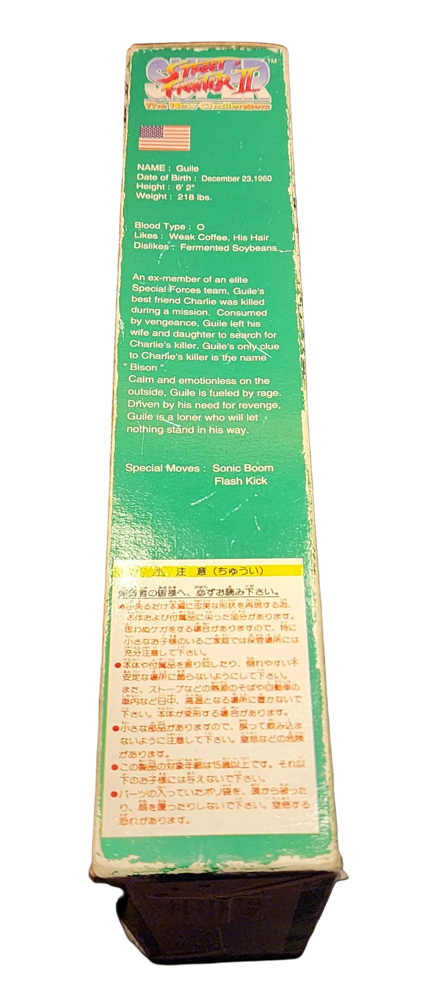 An old school and RARE Guile "doll-style" figure based on his Super Street Fighter II: The New Challengers appearance. The box design features Guile's SF2 Turbo / Hyper Fighting character art, the Super SF2 logo, and Guile's bio in Japanese.