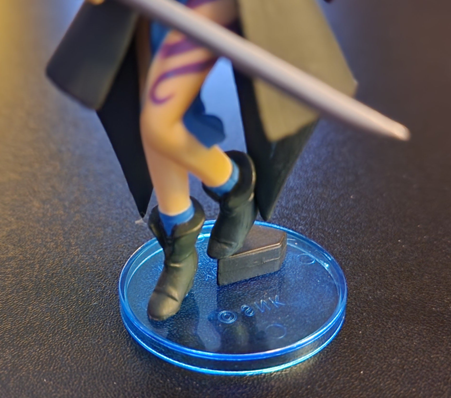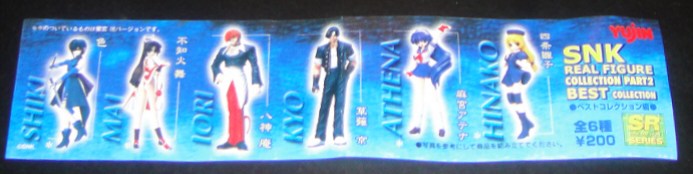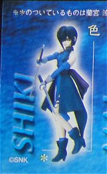 This figure comes with a blue translucent circular base that Shiki attaches to for easy displaying. The bottom of the base has "©SNK" inscribed. Also included is a black triangular foot support piece to help her stand easily for displaying. This figure comes with the orignal paper advertisement by Yujin displaying other characters from this series.